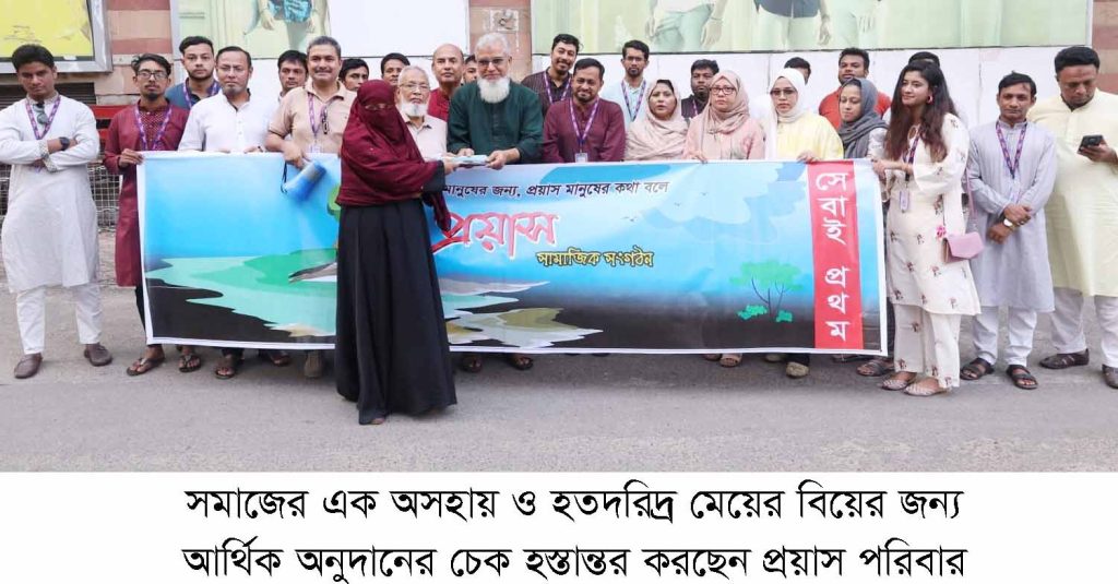 সামাজিক সংগঠন প্রয়াসের উদ্দ্যেগে গত ২৫ এপ্রিল শুক্রবার বিকালে মিমি সুপার মার্কেট সংলগ্ন এলাকায় সমাজের এক অসহায় ও হতদরিদ্র মেয়ের বিয়ের জন্য আর্থিক অনুদানের চেক হস্তান্তর করা হয়। প্রয়াসের প্রতিষ্ঠাতা সভাপতি হাসান মুরাদ চৌধুরী মামুনের সার্বিক পরিচালনায় প্রধান অতিথি ছিলেন ইঞ্জিনিয়ারস ইনস্টিটিউশন বাংলাদেশের সেন্ট্রাল মেম্বার প্রকৌশলী মোমিনুল হক।