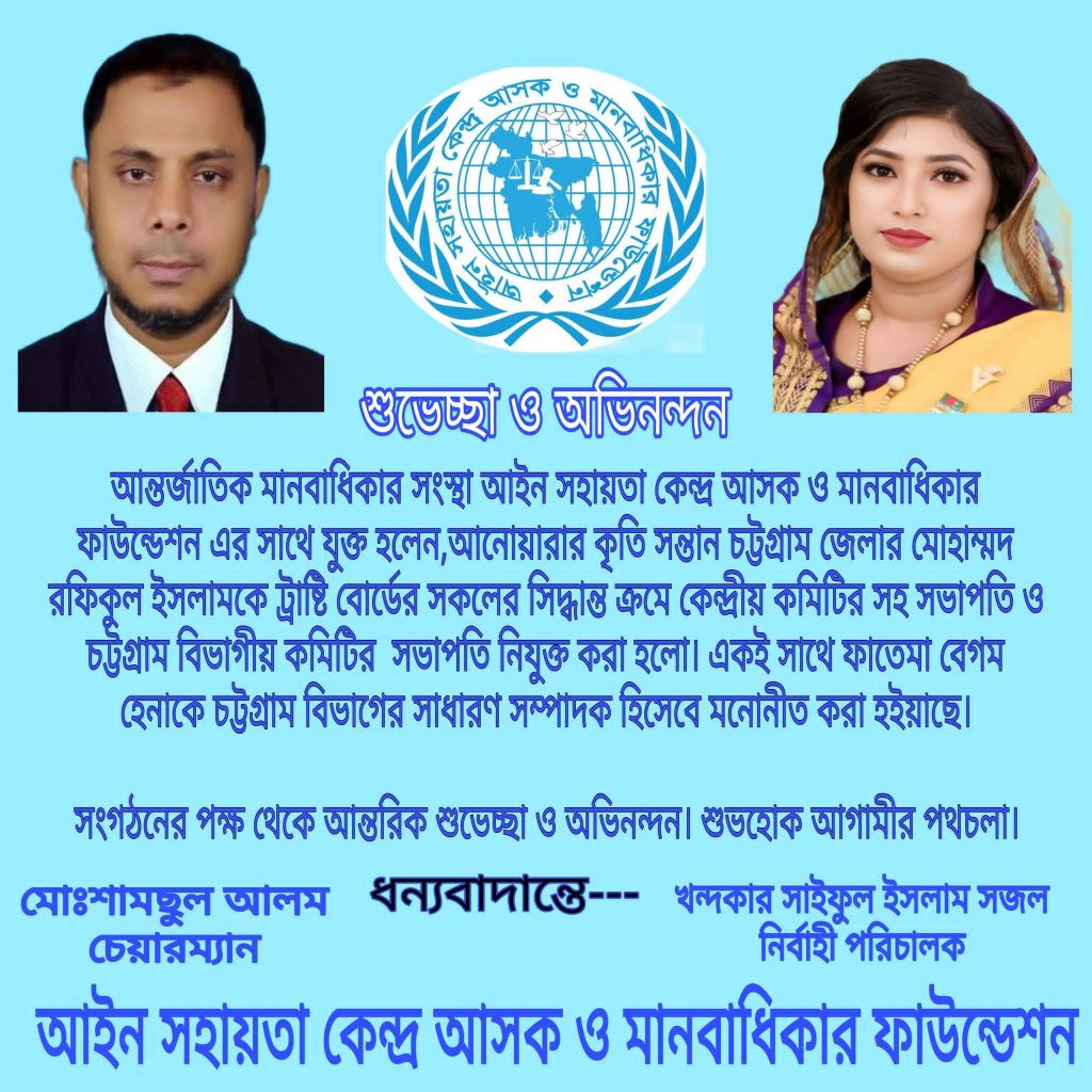 মানবাধিকার রক্ষা ও আইনি সহায়তা কার্যক্রমকে আরও শক্তিশালী করতে আইন সহায়তা কেন্দ্র (আসক) ও মানবাধিকার ফাউন্ডেশন তাদের কেন্দ্রীয় ও বিভাগীয় কাঠামোতে নতুন নেতৃত্ব ঘোষণা করেছে।