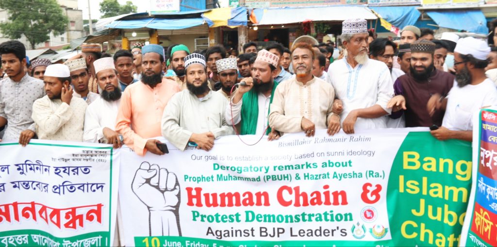 বক্তৃতা বলেন,রাসুল (দঃ) এর শানে অবমাননাকর বক্তব্যের একমাত্র শাস্তি মৃত্যুদন্ড।যতক্ষণ না পযর্ন্ত নপুর শর্মা ও নবীন জিন্দাল কে গ্রেফতার পূর্বক মৃত্যু দন্ড কার্যকর করবেননা ততক্ষণ পযর্ন্ত আন্দোলন অব্যাহত থাকবে। নেতৃবৃন্দ বাংলাদেশের পার্লামেন্টে এ বিষয়ে নিন্দা প্রস্তাব গ্রহণ পূর্বক ভারতীয় পণ্য বর্জনের দাবি জানানো হয়েছে।