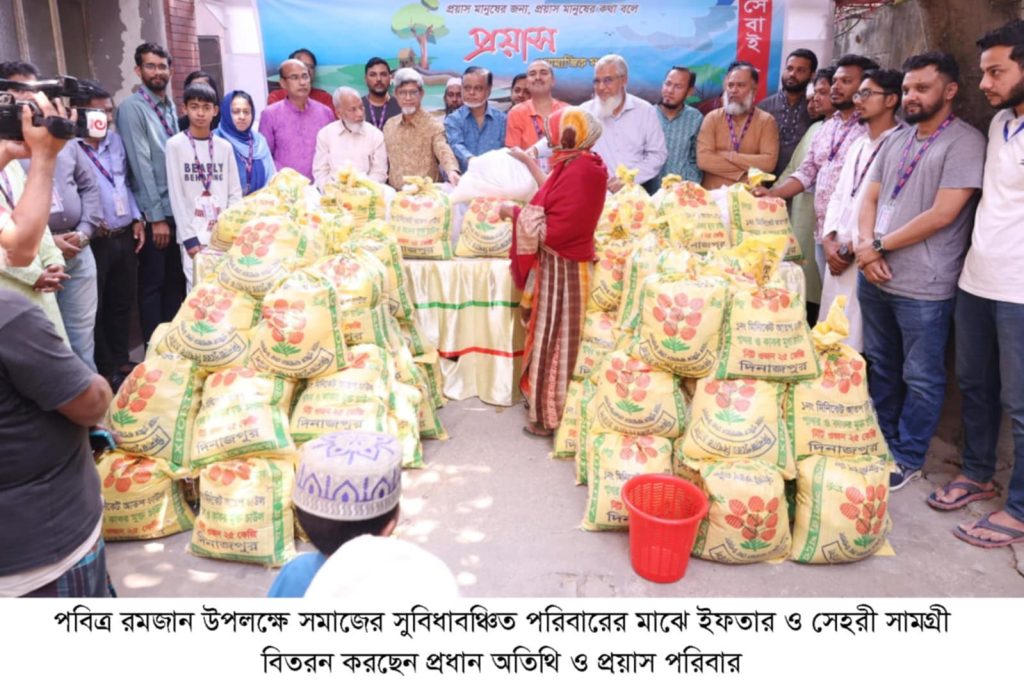 সামাজিক সংগঠন প্রয়াসের উদ্দ্যেগে পবিত্র রমজান মাস উপলক্ষে সমাজের নিন্ম আয়, কম ভাগ্যবান, এতিম ও হেফজখানায় ইফতার ও সেহরী সামগ্রী বিতরন অনুষ্ঠান সংগঠনের প্রতিষ্ঠাতা উপদেষ্টা মরহুম সামসুল আলম চৌধুরীর পূর্ব নাসিরাবাদ রহমান নগর আ/এস্থ বাসভবন প্রাঙ্গনে ৮ মার্চ শনিবার সকাল ১১ টায় অনুষ্ঠিত হয়।