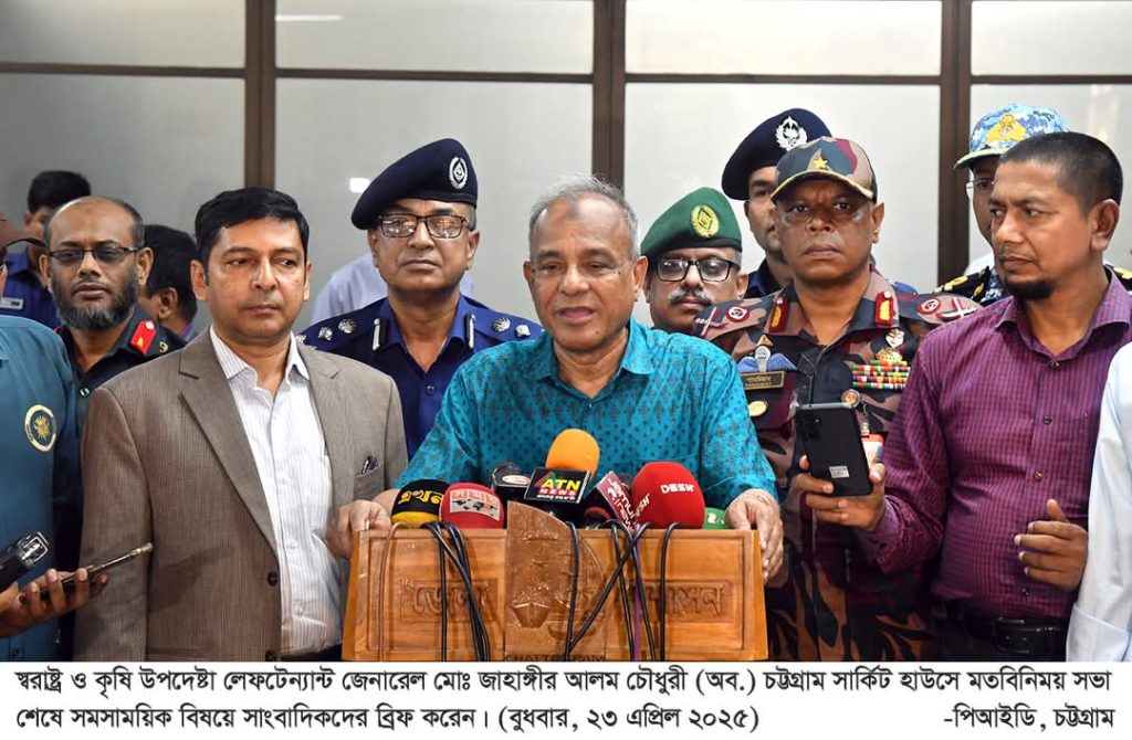আজ সার্কিট হাউজের সম্মেলন কক্ষে চট্টগ্রাম বিভাগের সকল জেলাপ্রশাসক, আইন-শৃঙ্খলা বাহিনী ও বিভিন্ন দপ্তর/সংস্থার কর্মকর্তাদের সাথে মতবিনিময় শেষে সাংবাদিকদের বিভিন্ন প্রশ্নের জবাবে স্বরাষ্ট্র ও কৃষি উপদেষ্টা লেফটেন্যান্ট জেনারেল মোঃ জাহাঙ্গীর আলম চৌধুরী (অব.) এসব কথা বলেন।