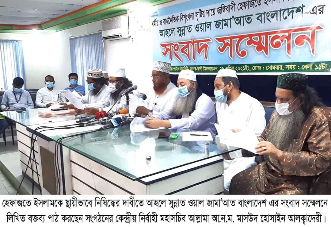 হেফাজতে ইসলামকে স্থায়ীভাবে নিষিদ্ধের দাবীতে আহলে সুন্নাত ওয়াল জামা’আত বাংলাদেশ এর সংবাদ সম্মেলন এপ্রিল ২৬, ২০২১